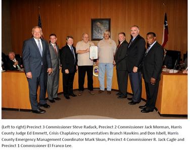 Chaplain Don Hawkins (pictured on left) began his appointment as a chaplain under Judge Robert Eckels in 2002. His vision was to build a volunteer agency of chaplains who could support their community as crisis chaplains. He has been able to do this under the Harris County Citizen Corps umbrella with the office of Homeland Security and Emergency Management for Harris County (pictured below). The Houston Chronicle featured the program in July of 2012. The article can be read here. Chaplain Hawkins (affectionately known as Don) is licensed to preach and certified by TDCJ (Texas Department of Criminal Justice) as a Volunteer Chaplain for the state of Texas. He volunteered in both the Harris County Jail System in Houston, Texas and Harris County Sheriff’s Department as Staff Chaplain for 18 years and also at the Ellis Unit in Huntsville, Texas for 12 years. He was chaplain over Death Row for 6 years.
